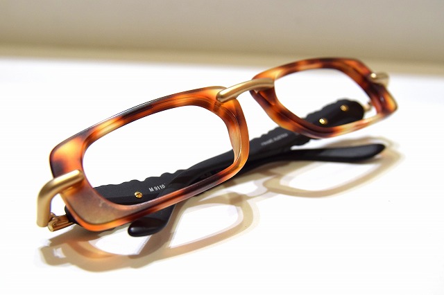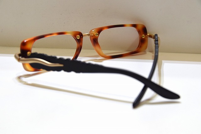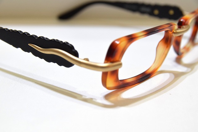 クラシカルなブラウンデミカラーのフロントに、彫刻的なゴールドブリッジと特徴的なテンプルデザインを組み合わせた、アート性の高い一本です。